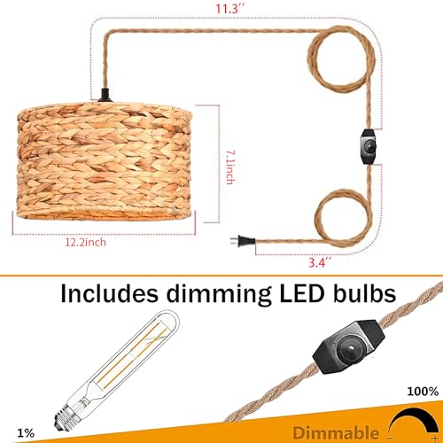 - 【Elegant Simple Design】-The total height of this woven hanging lamp is 7.1inch, the diameter is 11.8 inch. Our wicker lamp shade comes with 15 ft hanging cord allows you to easily adjust the height to fit your lighting needs, the switch located on the 3.5 ft from the plug, free yourself from bending over to turn it on/off